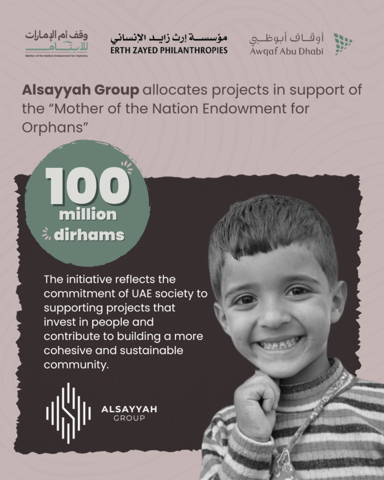 Alsayyah Grouphas allocated projects valued at AED 100 million in support of the “Mother of the Nation Endowment for Orphans” campaign, launched by the Endowments and Minors’ Funds Authority – Awqaf Abu Dhabi under the patronage of His Highness Sheikh Mohamed bin Zayed Al Nahyan, President of the UAE, with the aim of establishing a sustainable endowment funding source dedicated to supporting orphan care across the country, ensuring a more stable future and improved quality of life.