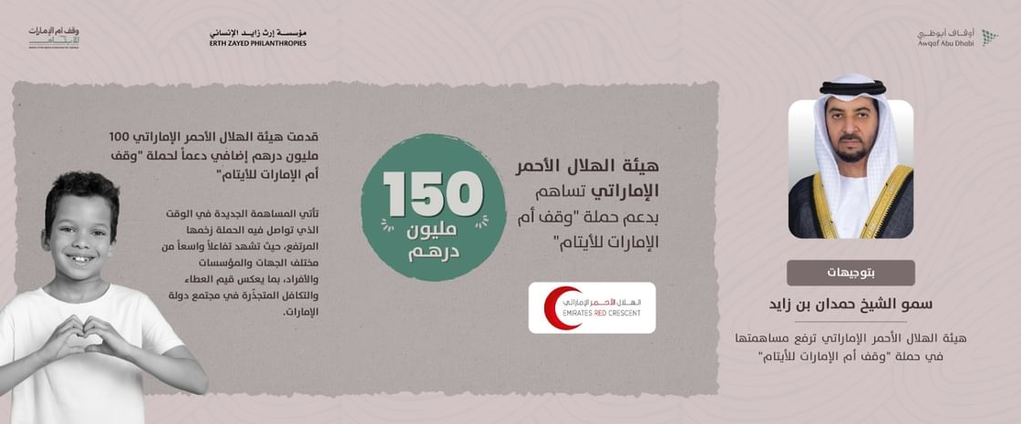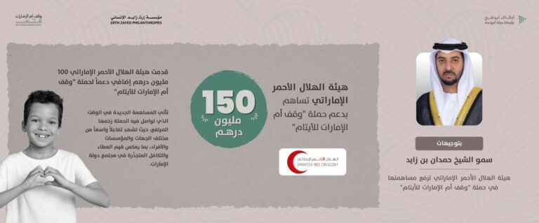 Under the directives of H.H. Sheikh Hamdan bin Zayed Al Nahyan, Ruler’s Representative in Al Dhafra Region and Chairman of the Emirates Red Crescent (ERC), the Authority has announced that it has raised its contribution to reach AED150 million in support of the Mother of the Nation Endowment for Orphans initiative, launched under the patronage of President His Highness Sheikh Mohamed bin Zayed Al Nahyan, by the Endowments and Minors’ Funds Authority – Awqaf Abu Dhabi.