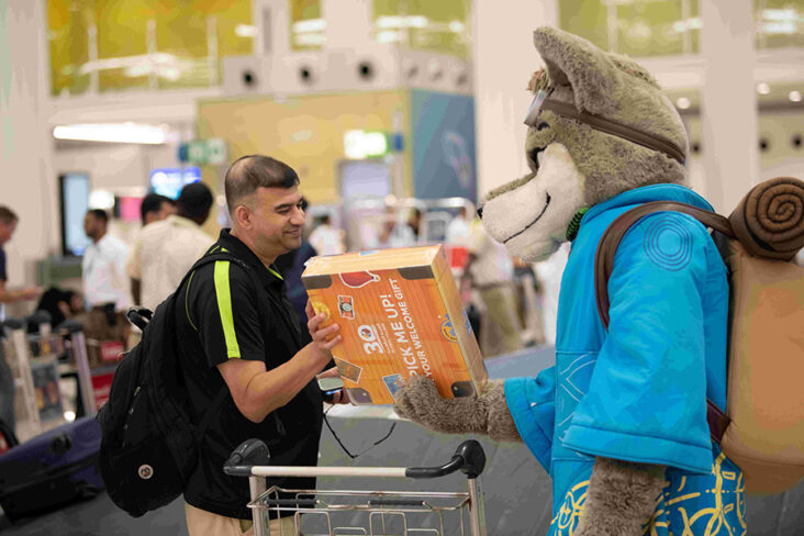 Each gift box featured a playful note reading, “Pick me up! I’m your welcome gift,” catching the attention of arriving passengers and bringing smiles as they spotted the boxes circling the baggage belts. The terminal buzzed with excitement as families, tourists, and residents alike unboxed their surprises, creating a memorable start to their visit to Dubai. The boxes were filled with exclusive Season 30 memorabilia such as themed water bottles and bags. Adding to the enjoyment, Global Village’s beloved mascots Zoya, Waleef and Ozka greeted passengers, posed for photos, and joined in the fun.