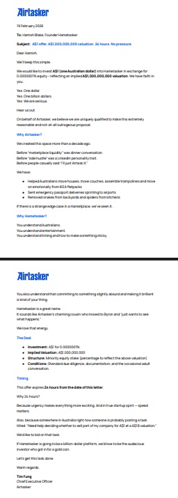 Fung has yet to receive a response,. The Airtasker CEO, who knows startup life well and has also ridden public market sentiment when it comes to his company’s share price, says he wanted to poke fun at software and technology valuations “that don’t really reflect the reality” amid investor hype around AI and claims that “software is dead” – something that’s also hit the share price of Nasdaq-listed Australia unicorn Atlassian, which has seen a two-thirds drop in its valuation over the past 12 months.