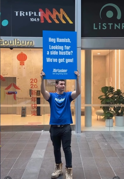 After spotting Blake touting for tasks on social media, the Airtasker team returned fire on Wednesday this week, posting a team member walking through Sydney with a sign saying “Hey Hamish, looking for a side hustle? We’ve got you!” before standing outside Listnr, where Blake hosts a podcast.