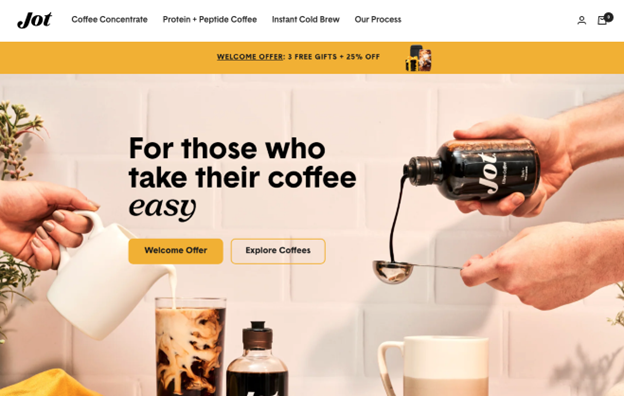 Jot’s “For those who take their coffee easy” value proposition perfectly describes the unique benefit its product offers — pre-made, high-quality coffee that removes the frustration of buying overpriced brews or waiting in line at a coffee shop.