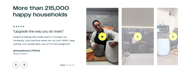 So, instead of allowing your audience’s skepticism to harm your conversion rates, simply reassure them through authentic user-submitted visuals. Lomi does it beautifully by embedding UGC videos on its homepage, which show exactly what its product looks like in real life.