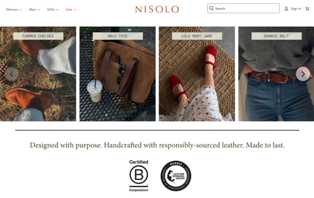 What’s helpful is that this can be really simple. Just look at how Nisolo implements this tactic on its homepage, where it states that its products are “handcrafted with responsibly-sourced leather” and points out that it’s a certified B-Corp.