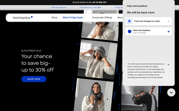 Ostrichpillow does this beautifully with a chat option on its website. Shoppers can ask for assistance during the evaluation stages of the buyer’s journey as well as request support regarding past purchases.