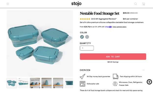 Check out how Stojo utilizes its shopping policies to build brand trust. On product pages, this business points out that its products include a 90-day money-back guarantee and 24-hour shipping.