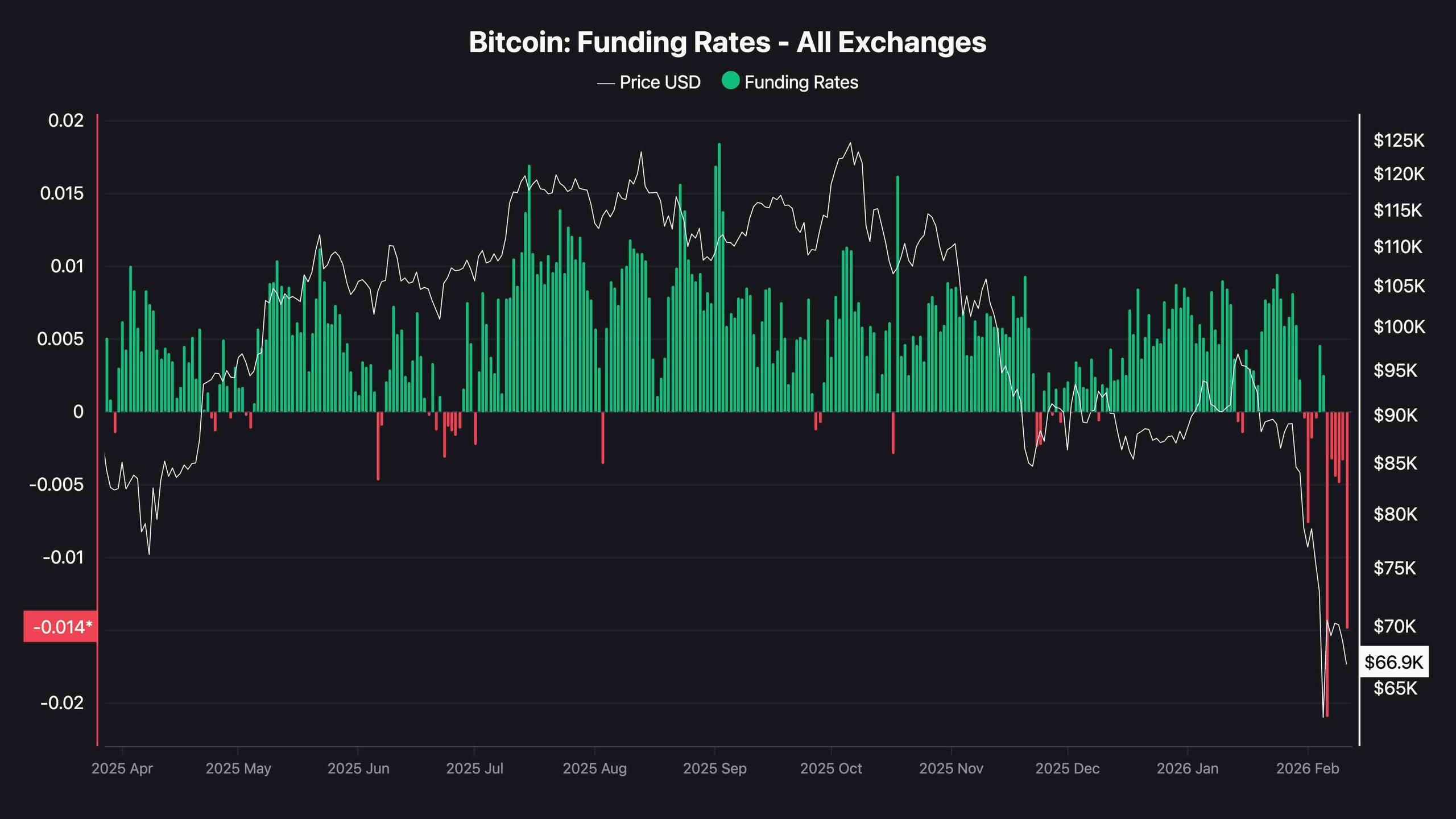 Bitcoin funding rates across all exchanges have recently flipped deeply negative, reaching extreme levels around -0.014 while the price dropped toward the $66.9K region. This sharp shift into negative territory signals aggressive short positioning, as traders are now paying a premium to hold bearish bets.