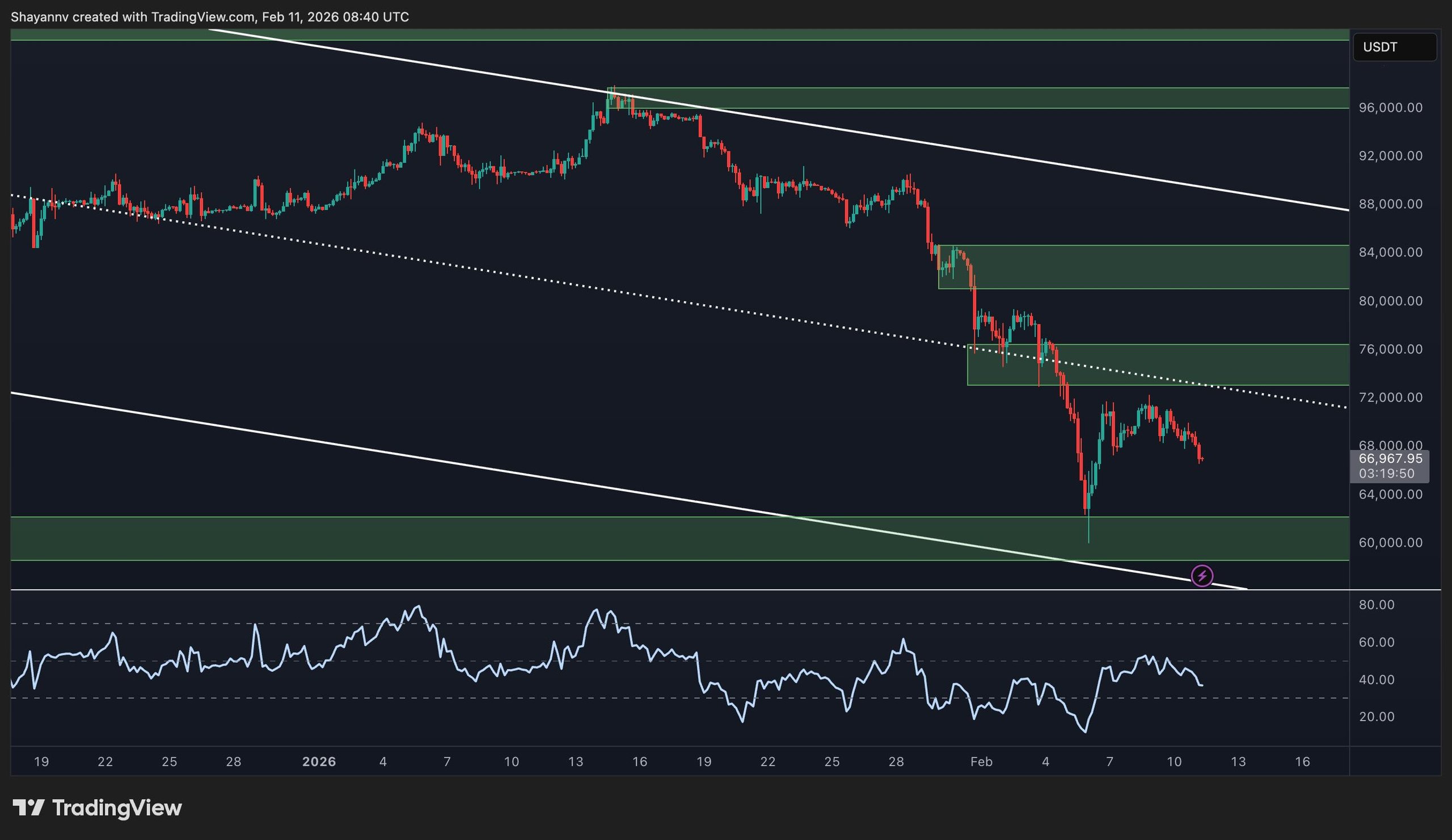 On the 4-hour chart, the rejection at $70K is more pronounced, with the asset retracing toward the $66K area. A notable bullish divergence between price action and the RSI suggests weakening downside momentum, increasing the probability of a short-term range-bound structure between the $60K and $75K levels.